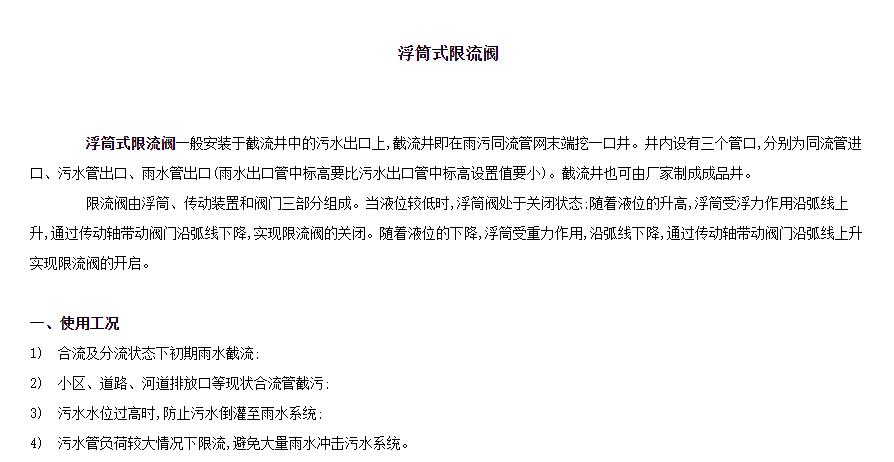 浮筒式限流閥功能當(dāng)雨水井內(nèi)水位上升,浮筒閥內(nèi)置閘板在浮筒的帶動(dòng)下關(guān)閉截污管口,防止大量雨水進(jìn)入污水管;